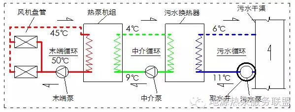 3)最后,45℃左右的末端系統(tǒng)水經(jīng)末端泵輸送,同樣在配置合理有效狀態(tài)下進入熱泵機組進行換熱,將熱泵機組從低溫那里轉(zhuǎn)化來的高溫熱量吸收,再以50℃左右進入末端散熱設備將熱量釋放給建筑空間,實現(xiàn)末端循環(huán)。