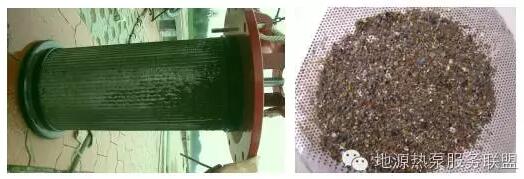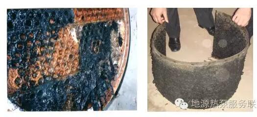 1)防堵塞。未處理原生污水中含有大尺度懸浮物,包括纖維狀的發(fā)絲類、紙屑類、藻狀類,普通的換熱設備是根本無法承受的。而實踐證明:已處理污水和地表水中的懸浮物含量相對較少,盡管與未處理原水不在同一數(shù)量級,但隨著運行時間增長,堵塞問題也立即突現(xiàn),原水的堵塞時間為1~3d,而地表水則為7~10d。圖4是未處理原生污水的堵塞現(xiàn)象,圖5是已處理污水的堵塞狀況。