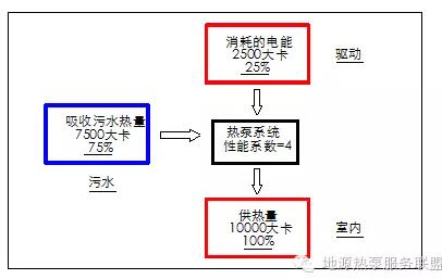5、節(jié)能與環(huán)保潛力巨大,消耗約25%的電能即可提取75%以上的污水熱能,得到100%的供熱熱能,系統(tǒng)能耗模式如圖3所示。使電能的利用率提高到4倍,若按火力發(fā)電0.33的效率計算,系統(tǒng)的一次能源利用率高達1.33,再高效的鍋爐效率也在0.9以下,考慮輔助能耗及熱損耗,污水熱泵空調(diào)系統(tǒng)的一次能源的節(jié)能幅度達45%以上。同時,CO2、NOx、SO2及粉塵的排放量也相應減少45%以上。另外,就具體項目本身而言,由于一套系統(tǒng)冬夏兩用,全年供應衛(wèi)生熱水,具有顯著的經(jīng)濟效益。較燃煤鍋爐加冷水機組、城市熱網(wǎng)加冷水機組、直燃機組等供熱空調(diào)方式相比,節(jié)省初投資及運行費用均在25%以上。